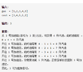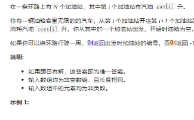class Solution { public: int canCompleteCircuit(vector<int>& gas, vector<int>& cost) { int i=0,n=gas.size(); bool isok=false; while(i<n){ if(i+1>=n)isok=true; int j=(i+1)%n,sumGas=gas[i],sumCost=cost[i],cnt=1; while(sumGas>=sumCost){ //if(i==2)cout<<sumGas<<' '<<sumCost<<' '<<cnt<<endl; if(j+1>=n)isok=true; cnt++,sumGas+=gas[j],sumCost+=cost[j],j=(j+1)%n; if(cnt==n+1)return i; } if(isok)return -1; i=j; } return -1; } };