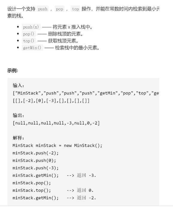 一个栈stk和一个同步最小栈minStk,当pushstk,val与minStktop比较,较小的push进minStk,当popstk,popminStk,当top时,返回stktop,当getMin时返回minStktop,另外一个思路是只用一个stk,元素是pair<int,int>当前值和最小值,push时最小值用min(val,stk.top().second)不过时空不变