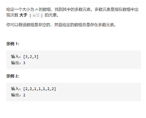 变量简洁正确完整思路 随机找一个数0-n-1的下标i,计数nums[i]是否超过一半 class Solution { public: int majorityElement(vector<int>& nums) { while(1){ int i=rand()%nums.size(); int count=0; for(int num:nums){ if(num==nums[i])count++; } if(count>nums.size()/2)return nums[i]; } } }; 变量简洁正确完整思路 投票法(不同国家士兵以一抵一除了自己人都可以杀,最后剩下的就是众数) ,国家country初始-1,士兵count初始0,正向,遇到不同国家num则count--, 如果count<0则country被取代为num,遇到相同国家num则count++ class Solution { public: int majorityElement(vector<int>& nums) { int country=-1,count=0; for(int num:nums){ if(num!=country){ --count; if(count==-1)country=num,count=0; }else ++count; } return country; } };
