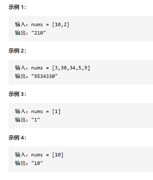变量简洁正确完整思路 模拟一下,对于const int&a,const int&b return ab>ba, 对于2342 231 2342*1000+231 >231*10000+2342 class Solution { public: string largestNumber(vector<int>& nums) { sort(nums.begin(),nums.end(),[](const int &a,const int&b){ //cout<<a<<' '<<b<<endl; long long aa=10,bb=10; while(aa<=b)aa*=10; while(bb<=a)bb*=10; return a*aa+b>b*bb+a; }); if(nums[0]==0)return "0"; string ans; for(int num:nums)ans+=to_string(num); return ans; } }; 踩过的坑 sort用lambda,const&,return 左边>右边则排序也是左边>右边,return 左边<右边则排序也是左边<右边