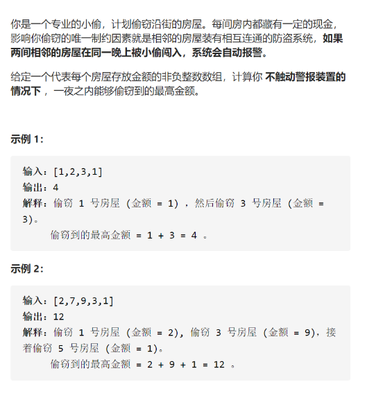 变量间接正确完整思路 精确定义 dpi 到第i家最多钱,dp0表示空,dp1表示第一家 转移 2 7 9 3 1 dp i=maxdp i-1 dpi-2+val 初始化 dp0 =0 dp1=nums[0] class Solution { public: int rob(vector<int>& nums) { int n=nums.size(); vector<int>dp(n+1,0); dp[1]=nums[0]; for(int i=2;i<=n;i++){ dp[i]=max(dp[i-1],dp[i-2]+nums[i-1]); } return dp[n]; } }; 状态压缩,由于i只在左边,i-1,i-2只在右边,直接弄 class Solution { public: int rob(vector<int>& nums) { int n=nums.size(); vector<int>dp(3,0); dp[1]=nums[0]; for(int i=2;i<=n;i++){ dp[i%3]=max(dp[(i-1)%3],dp[(i-2)%3]+nums[i-1]); } return dp[n%3]; } };