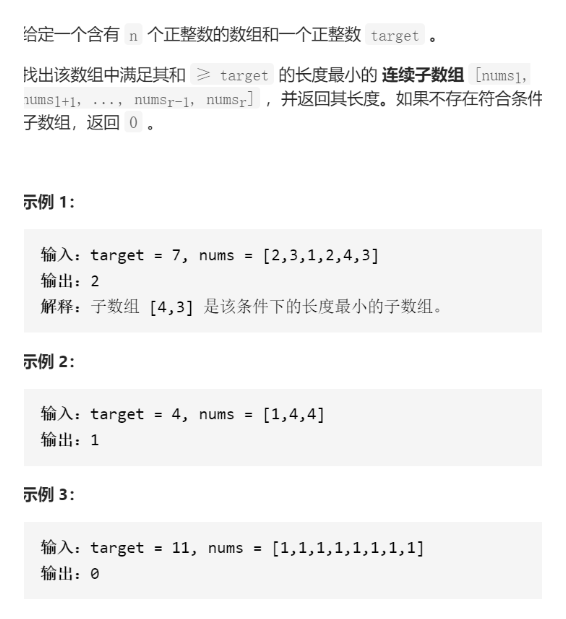变量简洁正确完整思路 滑动窗口,leftright是第一个最后一个,元素和add维持target,小于,right++add+= 大于等于更新ans,left++add-= class Solution { public: int minSubArrayLen(int target, vector<int>& nums) { int left=0,right=-1,add=0,ans=0x3f3f3f3f,n=nums.size(); while(right<n){ //cout<<left<<right<<' '<<add<<endl; if(add<target){ if(right==n-1)break; else add+=nums[++right]; } else{ ans=min(ans,right-left+1); add-=nums[left]; left++; } } return ans==0x3f3f3f3f?0:ans; } }; 踩过的坑 遇到bug立刻cout恰当的东西,如while开头的下标和关键量如cur、add