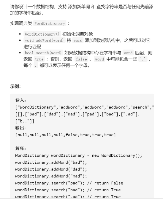 变量简洁正确完整思路 字典树,查找用dfs,形参beg,word,root,判断root树是否有beg为开始下标的word,如果root树为空边界返回false,如果beg==n则边界返回root->isEnd,最后返回,如果是。则26个只要有一个dfs得出root->next树有以beg+1的就是root树有,返回true,否则26都没有返回false,或者是字母,dfs判断root->next[word[beg]-'a']这棵树是否有 class WordDictionary { public: WordDictionary() { isEnd=false; memset(next,0,sizeof(next)); } void addWord(string word) { WordDictionary*node=this; for(char c:word){ if(!node->next[c-'a'])node->next[c-'a']=new WordDictionary(); node=node->next[c-'a']; } node->isEnd=true; } bool search(string word) { return dfs(0,word,this); } bool dfs(int beg,string&word,WordDictionary*root){ if(!root)return false; if(beg==word.size())return root->isEnd; if(word[beg]=='.'){ for(int i=0;i<26;i++){ if(dfs(beg+1,word,root->next[i]))return true; } return false; }else return dfs(beg+1,word,root->next[word[beg]-'a']); } private: bool isEnd; WordDictionary*next[26]; }; 踩过的坑 if(beg==word.size())return root->isEnd; mmd,这里是root->isEnd,是root树的,不是this->isEnd,root树是this树的子树 字典树当前节点是没有字母的,也就是说不用判断的,字母在箭头上,只需要dfs找到 字母对应的箭头来比较就可以形成递归