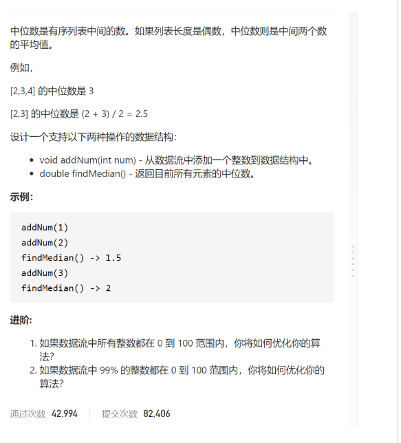插入排序,往已经排好序的插入一个元素就用插入排序 class MedianFinder { public: vector<int>nums; /** initialize your data structure here. */ MedianFinder() { } void addNum(int num) { nums.push_back(num); int tmp=num; int i=nums.size()-2; while(i>=0&&nums[i]>tmp){ nums[i+1]=nums[i]; i--; } nums[i+1]=tmp; } double findMedian() { int n=nums.size(); for(auto a:nums)cout<<a<<' '; cout<<endl; if(n%2==1)return nums[n/2]; else return (nums[n/2-1]+nums[n/2])*0.5; } }; /** * Your MedianFinder object will be instantiated and called as such: * MedianFinder* obj = new MedianFinder(); * obj->addNum(num); * double param_2 = obj->findMedian(); */ 大小堆,nums较小一半放在最大堆,较大一半放在最小堆,则中位数容易 如何维护大小堆各一半?123456 1先放到max,在pop到min,如果min多了一个,pop到max, 2先放到max,在pop到min,如果min相同,不变 类似于 1 1 12 1 13 1 12 1 2 2 23 3 class MedianFinder { public: priority_queue<int>max; priority_queue<int,vector<int>,greater<int>>min; /** initialize your data structure here. */ MedianFinder() { } void addNum(int num) { max.push(num); min.push(max.top()); max.pop(); if(max.size()==min.size()-1){ max.push(min.top()); min.pop(); } } double findMedian() { if(max.size()==min.size())return 0.5*(max.top()+min.top()); else return max.top(); } }; 平衡二叉搜索树 low high迭代器指向中位数, 奇数 123 指向2 偶数 1234 指向23 奇数 123 插入num=3>*low 1234 low2 high3 num=2==*low 1223 low2 high2 num=1<*low 1123 low 1 high 2 偶数 1234 插入num=1<*low 11234 low=high=2 num=2==low 12234 low=high=2 num=3==high 12334 low=high=3 num=4>*high 12344 low=high=3 num=2.5 122.534 low=high=2.5 class MedianFinder { public: multiset<int>rbtree; multiset<int>::iterator low,high; /** initialize your data structure here. */ MedianFinder() { } void addNum(int num) { if(!rbtree.size()){ rbtree.insert(num); low=rbtree.begin(); high=rbtree.begin(); } else { int n=rbtree.size(); rbtree.insert(num); if(n&1){ if(num>*low)high++; else if(num==*low)high++; else low--; }else { if(num<*low)high--; else if(num==*low)low++,high--; else if(num>*low&&num<*high)low++,high--; else if(num==*high)low++; else if(num>*high)low++; } } } double findMedian() { return low==high?*low:(*low+*high)*0.5; } }; /** * Your MedianFinder object will be instantiated and called as such: * MedianFinder* obj = new MedianFinder(); * obj->addNum(num); * double param_2 = obj->findMedian(); */ 踩过的坑 stl保障排序稳定性123 插入2,则1223第二个2才是插入的2,第一个2是原本的2 else if(num>*low&&num<*high)low++,high--;