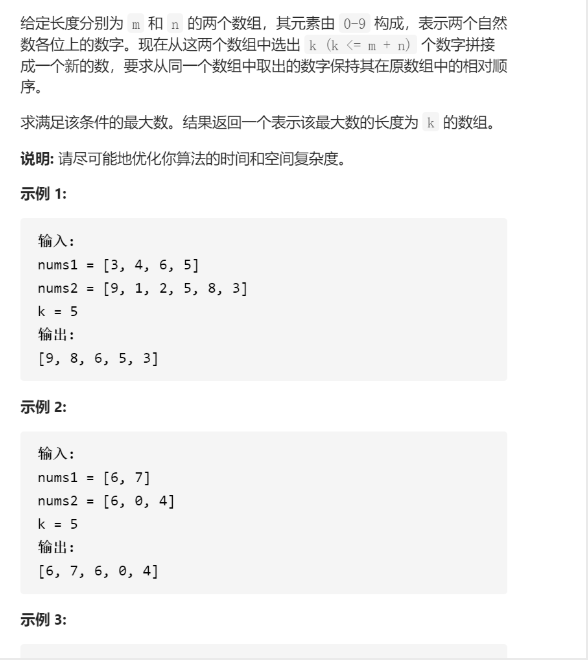 [image:1628696379919.png] 变量简洁正确完整思路 单调栈能够在保证相对顺序下,找到一个最大的组合,因为遇到更大的只要pop掉 前面较小的这就是单调栈,但是对长度有限制导致后半部分不用考虑pop不单调, 合并nums1nums2只需要大的放前面,但是相等,因为不是单调,所以需要一直往后面比较(易错),更新答案 class Solution { public: vector<int> maxNumber(vector<int>& nums1, vector<int>& nums2, int k) { vector<int>ans; for(int i=0;i<=k;i++){ if(i>nums1.size()||k-i>nums2.size())continue; //cout<<i<<k-i<<endl; vector<int>nums3=getNums(nums1,i); vector<int>nums4=getNums(nums2,k-i); //cout<<nums3.size()<<nums4.size()<<endl; vector<int>ans1=mergeNums(nums3,nums4); //for(int num:ans1)cout<<num<<' '; //cout<<endl; if(compareNums(ans,ans1))ans=ans1; } return ans; } bool compareNums(vector<int>&ans,vector<int>&ans1){ int n=ans.size(),m=ans1.size(); if(n<m)return true; if(n>m)return false; for(int i=0;i<n;i++){ if(ans[i]<ans1[i])return true; if(ans[i]>ans1[i])return false; } return false; } vector<int>mergeNums(vector<int>&nums3,vector<int>&nums4){ vector<int>ans; int i=0,j=0; //for(int num:nums3)cout<<num<<' '; //cout<<endl; //for(int num:nums4)cout<<num<<' '; //cout<<endl; while(i<nums3.size()||j<nums4.size()){ if(j>=nums4.size()||i<nums3.size()&&nums3[i]>nums4[j]){ ans.push_back(nums3[i]); i++; }else if(i>=nums3.size()||j<nums4.size()&&nums3[i]<nums4[j]){ ans.push_back(nums4[j]); j++; }else if(nums3[i]==nums4[j]){ //cout<<nums3[i]<<nums4[j]<<endl; int ii=i+1,jj=j+1; bool isNum3=false; while(1){ if(ii==nums3.size())break; if(jj==nums4.size()){ isNum3=true; break; } if(nums3[ii]>nums4[jj]){ isNum3=true; break; } if(nums3[ii]<nums4[jj])break; ii++,jj++; } if(isNum3){ ans.push_back(nums3[i]); i++; }else { ans.push_back(nums4[j]); j++; } } } return ans; } vector<int>getNums(vector<int>&nums,int n){ deque<int>deq; int drop=nums.size()-n; for(int i=0;i<nums.size();i++){ while(!deq.empty()&&deq.back()<nums[i]){ if(drop==0)break; deq.pop_back(); drop--; } if(deq.size()<n)deq.push_back(nums[i]); else drop--; } vector<int>ans; while(!deq.empty()){ ans.push_back(deq.front()); deq.pop_front(); } return ans; } }; 踩过的坑,超级大坑 合并两个数列,这两个数列并不是单调的,因为后面并不单调 所以相同的时候,并不是随便选一个,而是要继续往后比较,直到大的就合并