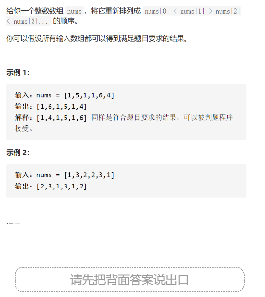 变量简洁正确完整思路 快速选择找到中点n-1)/2的值midNum 找到中点midNum后,用三分法将<放左边,=放中间,>放右边, 00 111 56 i从mid往左,j从n-1往左,才能1这个重复的放在最两侧 不能i从0往右,j从mid+1往右,不能保障1这个重复的在最左边 三分法123222225走一遍,可以给一个num,分成< = >三部分,i前面是<,k后面是>,ij从0开始,k从n-1开始 numj大于num就把numj放到numk处k--但j不能++因为k的数可能是<的,numj小于num就把numj放到numi处并 i++j++,为什么用j++因为i的一定是小于或者等于的,否则j++ class Solution { public: void wiggleSort(vector<int>& nums) { int n=nums.size(); //快速选择 int mid=(n-1)/2; dfs(0,n-1,mid,nums); //三分法 int midNum=nums[mid]; threePart(nums,midNum); int i=mid,j=n-1; vector<int>tmp; while(i>=0){ tmp.push_back(nums[i]);i--; if(j>mid){ tmp.push_back(nums[j]);j--; } } copy(tmp.begin(),tmp.end(),nums.begin()); } void threePart(vector<int>&nums,int midNum){ int i=0,j=0,k=nums.size()-1; while(j<k){ if(nums[j]>midNum){ swap(nums[j],nums[k]); k--; }else if(nums[j]<midNum){ swap(nums[j],nums[i]); i++,j++; }else j++; } } void dfs(int beg,int end,int mid,vector<int>&nums){ if(beg>end)return; int i=beg,j=end; while(i<j){ while(nums[j]>=nums[beg]&&j>i)j--; while(nums[i]<=nums[beg]&&i<j)i++; if(i<j)swap(nums[i],nums[j]); } swap(nums[beg],nums[i]); if(i==mid)return; if(i<mid)dfs(i+1,end,mid,nums); if(i>mid)dfs(beg,i-1,mid,nums); } };