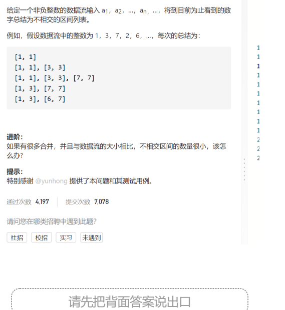 变量简洁正确完整思路 map<int左边界,int右边界>left2right map<Int右边界,int左边界>right2left 可以利用右边界查找左边界,可以利用左边界查找右边界 对于num,查找num-1作为右边界的左边界和num+1作为左边界的右边界 如果都有,新的左边界right2left[num-1] 新的右边界left2rightleft2right[num+1] 删掉原来的, 如果有左边界 如果有右边界 如果都没有 输出,因为map是排序的所以非常容易 class SummaryRanges { public: map<int,int>left2right,right2left; /** Initialize your data structure here. */ SummaryRanges() { } void addNum(int val) { auto iter=right2left.lower_bound(val); if(iter!=right2left.end()&&iter->second<=val)return; int hasLeft=right2left.count(val-1); int hasRight=left2right.count(val+1); if(hasLeft==1&&hasRight==1){ int left=right2left[val-1]; int right=left2right[val+1]; //cout<<left<<' '<<right<<' '<<val<<endl; right2left.erase(val-1); left2right.erase(val+1); right2left[right]=left; left2right[left]=right; //cout<<right2left[val+1]<<' '<<val+1<<endl; //cout<<left<<' '<<left2right[val-1]<<endl; } else if(hasLeft==1&&hasRight==0){ int left=right2left[val-1]; //cout<<left<<' '<<val<<endl; right2left.erase(val-1); left2right.erase(left); right2left[val]=left; left2right[left]=val; } else if(hasLeft==0&&hasRight==1){ int right=left2right[val+1]; right2left.erase(right); left2right.erase(val+1); right2left[right]=val; left2right[val]=right; }else if(hasLeft==0&&hasRight==0){ left2right[val]=val; right2left[val]=val; } } vector<vector<int>> getIntervals() { vector<vector<int>>ans; for(auto &mPair:left2right){ ans.push_back({mPair.first,mPair.second}); } return ans; } }; /** * Your SummaryRanges object will be instantiated and called as such: * SummaryRanges* obj = new SummaryRanges(); * obj->addNum(val); * vector<vector<int>> param_2 = obj->getIntervals(); */ 踩过的坑 right2left[right]=left; left2right[left]=right; //right2left.insert({right,left}); //left2right.insert({left,right}); 不能用insert插入,因为这是映射关系,直接给一个数组会看做两次插入,map不需要 使用insert 如果已经有了,就直接跳过,比如[8,6],来了6,用lower_bound找到第一个大于等于 6,second小于等于6就跳过 lower_bound是大于等于,upper_bound是大于,没有任何小于