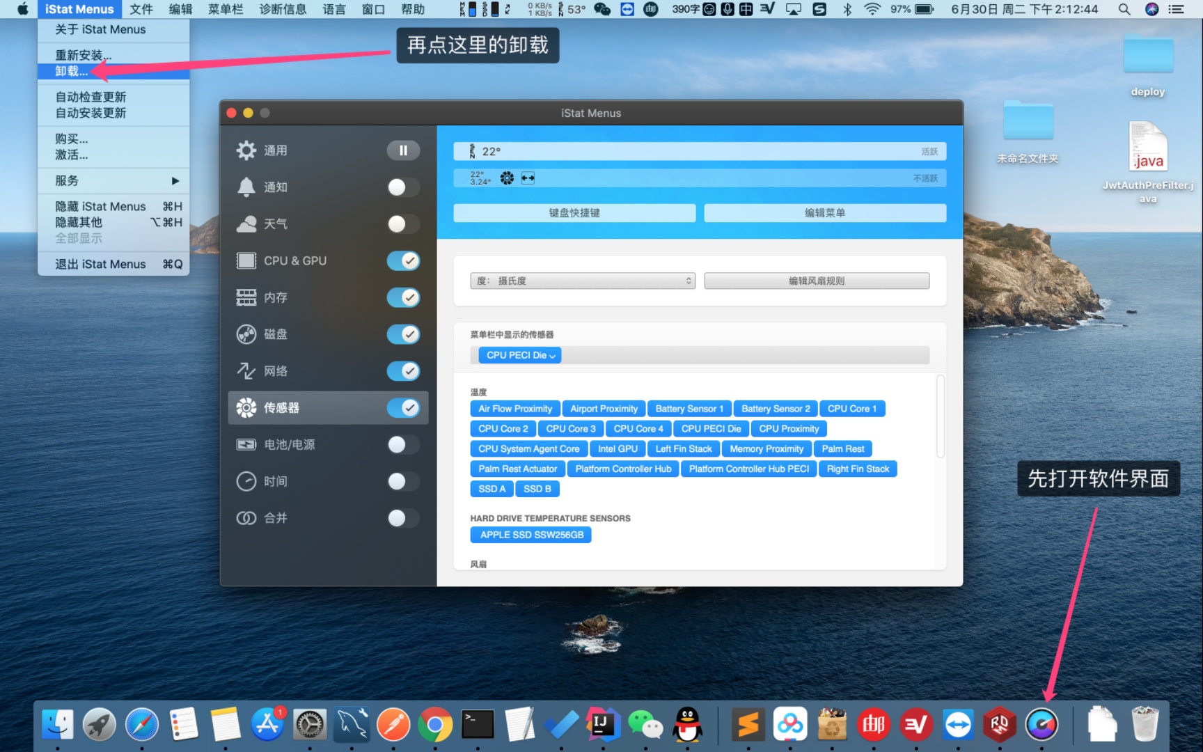 2. 在软件页面选择左上角苹果图标右边的iStat Menus,选择里边的卸载进行操作,英文版的叫Uninstall,卸载完成之后,风扇转速就恢复正常了