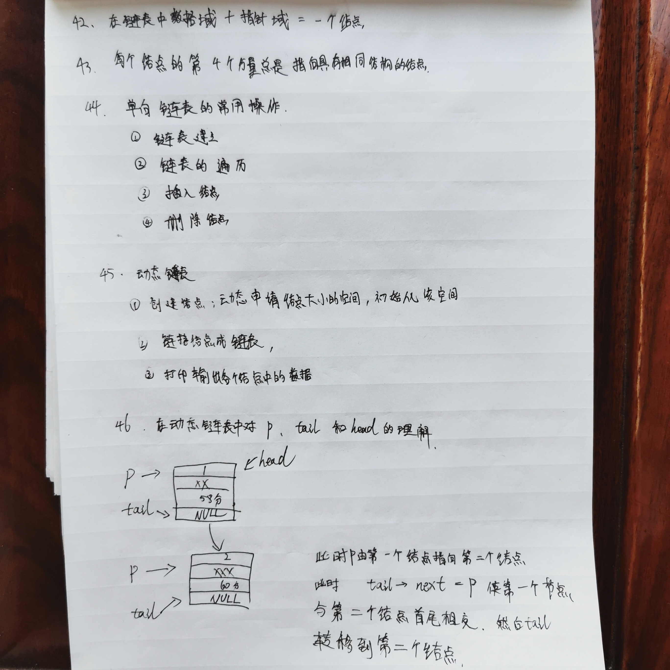 在开始的学习中,只知道结点的建立,不知道结点是通过怎样的方式连接在一起。经过老师课堂的讲解我明白了结点的连接过程,也明白了head、p、tail这几个结构指针的使用过程以及他们各自的作用,我也把他们以流程的形式写入学习笔记当中。
