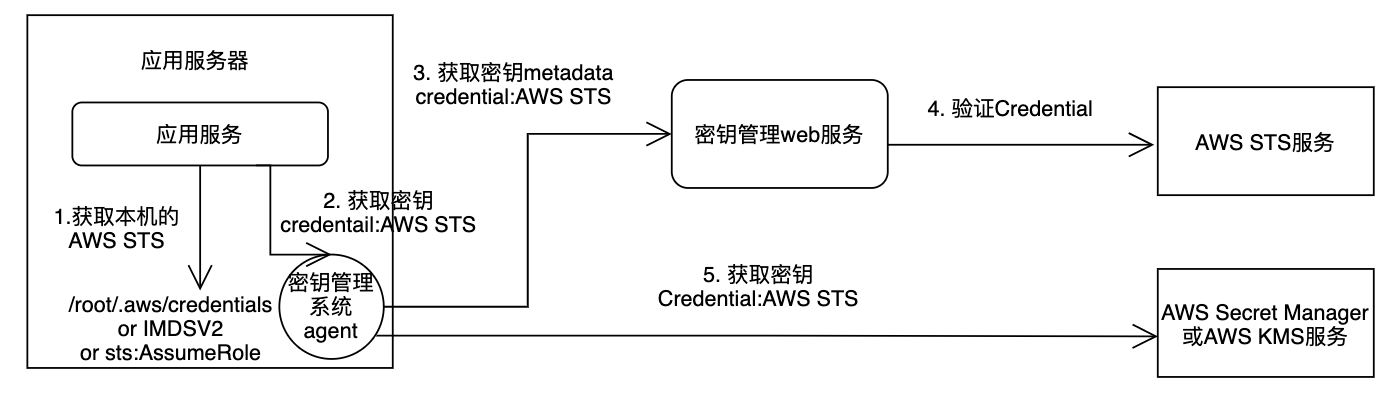 第二步:应用服务通过密钥管理系统的agent获取密钥。agent运行在VM上只支持本机访问, agent从web端获取密钥的metadata然后访问AWS Secret Manager或KMS直接获取secrets。采用agent的主要好处是实现方便,避免不同的语言的应用服务都实现一遍同样的逻辑。为什么不通过密钥管理的web服务直接获取secrets呢,即把4&5并成一步。主要是出于安全方面的考虑,如果所有服务都通过密钥管理系统的web服务获取secrets,这个web服务如果有安全漏洞(比如heap dump)的话,可能会导致所有应用服务的密钥都有丢失的风险。基于安全性的考虑,应用服务直接找AWS获取密钥中间不经过任何其他的系统是最安全的。