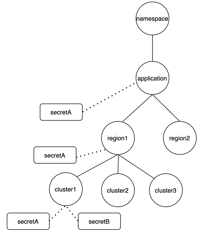 不管是AWS KMS还是AWS Secret Manager都不提供复杂的密钥的组织管理功能比如namespace,层级关系,覆盖关系等。但是这方面对业务和运维是非常重要的,我们在实践中采用了树状结构来对密钥进行组织。