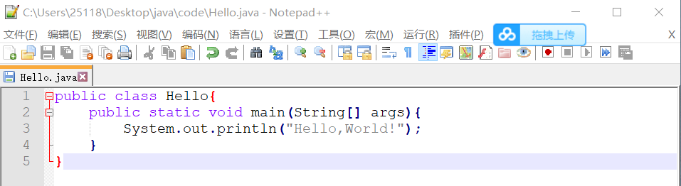 3.文件名和类名要一致(本文中,Hello是文件名,所以在输入代码的第一行public class 后面就必须是Hello)