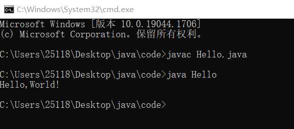 3.继续在cmd指令面板里输入Java Hello,就会出现我们想让他输出的“hello world”
