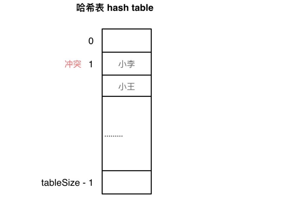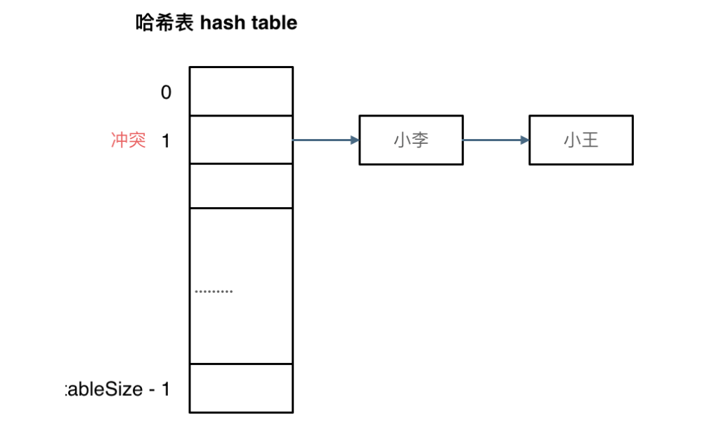 如图所示,小李和小王都映射到了索引下标 1 的位置,这一现象叫做哈希碰撞。