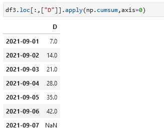 可以对dataframe应用某个函数,也可以对指定的行或列应用,以累计和函数np.cumsum为例。