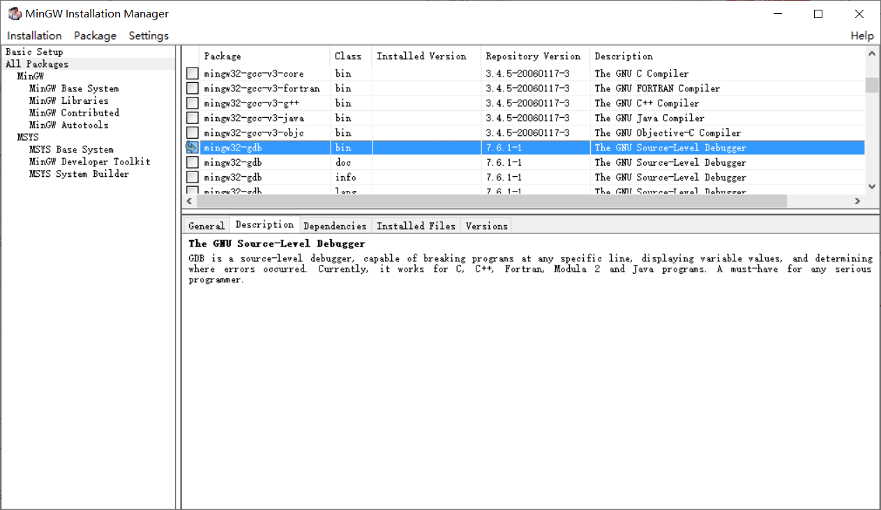 选择mingw32-gcc.bin, mingw32-gcc-g++.bin, 以及mingw32-gdb.bin 下载。