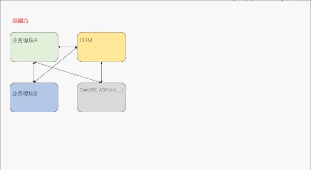 比如模块A直接操作了模块B中数据, 则视为强耦合, 若A只是通过数据与模块B交互, 则视为弱耦合.