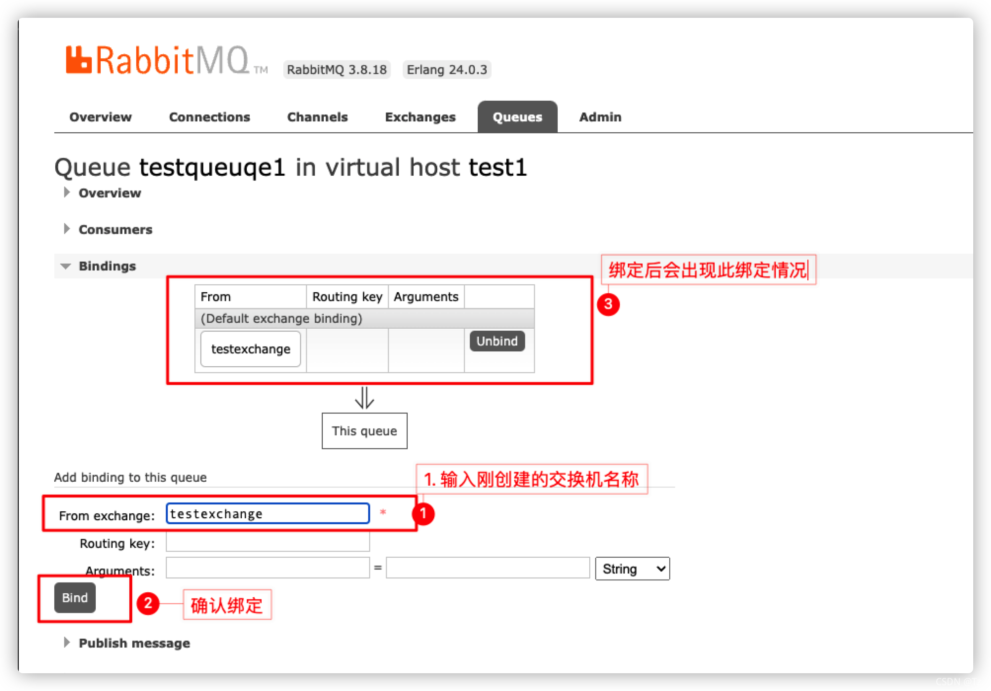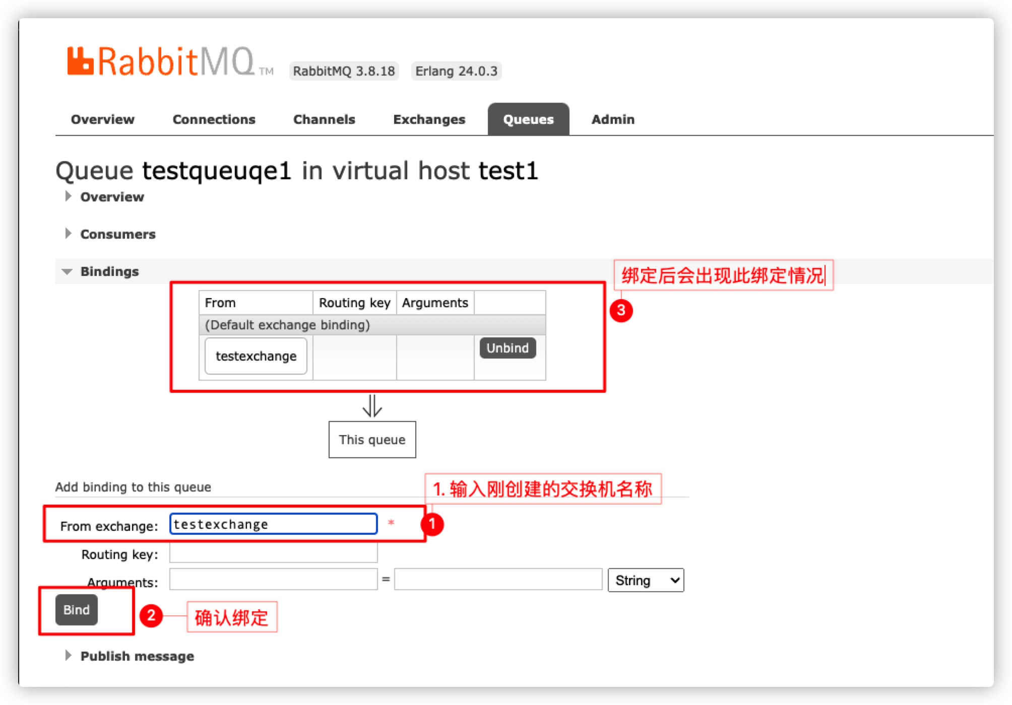 2)将交换机与队列进行绑定(下图是创建testqueuqe1绑定过程、testqueuqe2绑定也是如此,不再演示)