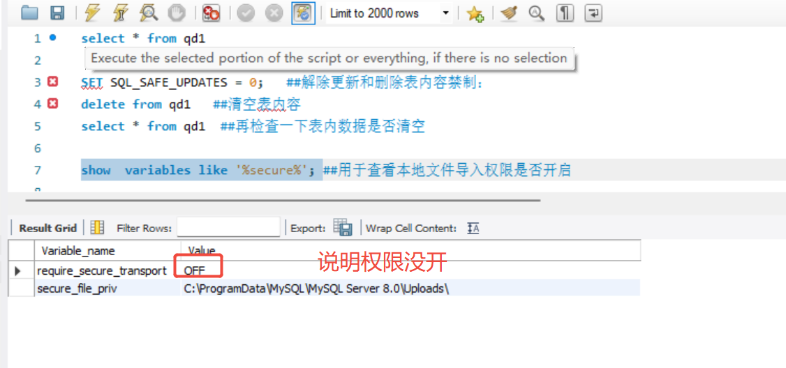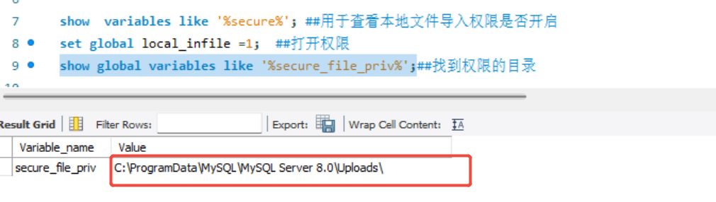 show variables like '%secure%'; ##用于查看本地文件导入权限是否开启