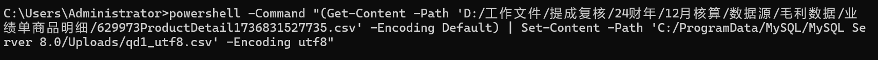 powershell -Command "(Get-Content -Path 'D:/工作文件/提成复核/24财年/12月核算/数据源/毛利数据/业绩单商品明细/629973ProductDetail1736831527735.csv' -Encoding Default) | Set-Content -Path 'C:/ProgramData/MySQL/MySQL Server 8.0/Uploads/qd1_utf8.csv' -Encoding utf8"