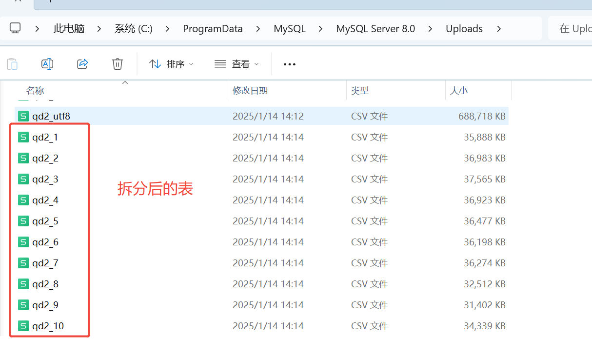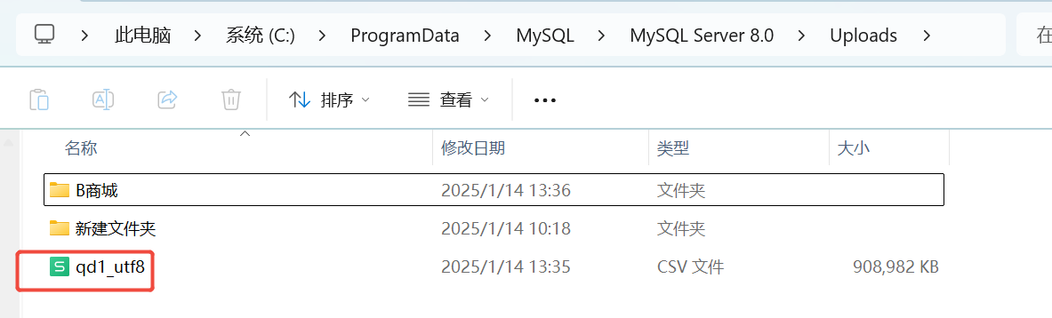 步骤三:将csv文件移到C:/ProgramData/MySQL/MySQL Server 8.0/Uploads/此目录,并转为utf8,cmd可实现