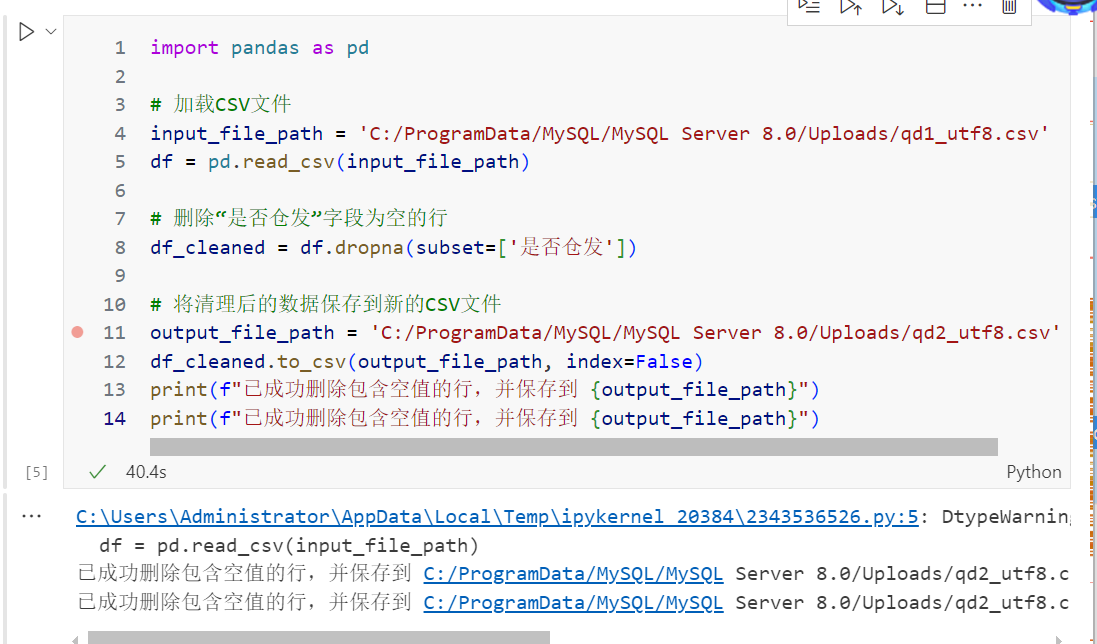 步骤四:简单清洗数据,如果数据不需要清洗可忽略此项,因为我这个数据是否仓发列为null的数据乱码(用的python)