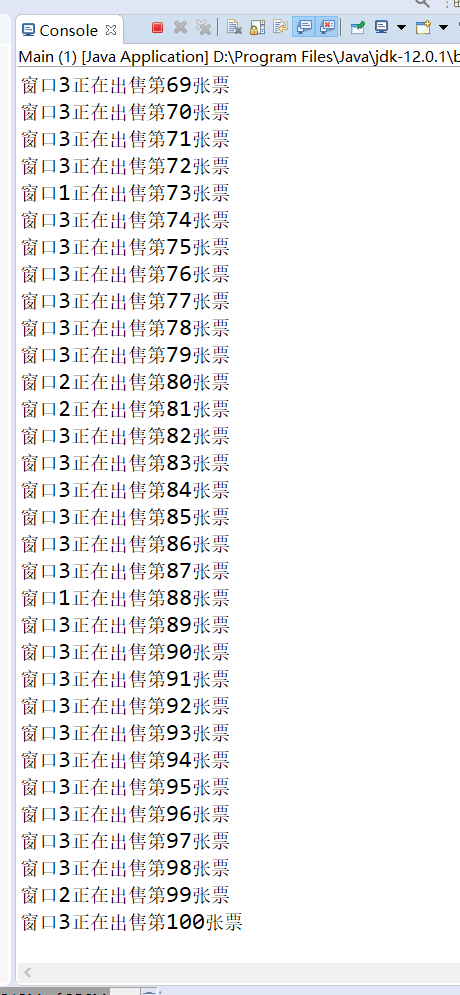 System.out.println(Thread.currentThread().getName()+"正在出售第"+ticket+"张票");