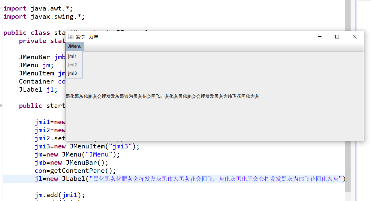 jl=new JLabel("黑化黑灰化肥灰会挥发发灰黑讳为黑灰花会回飞;灰化灰黑化肥会会挥发发黑灰为讳飞花回化为灰");