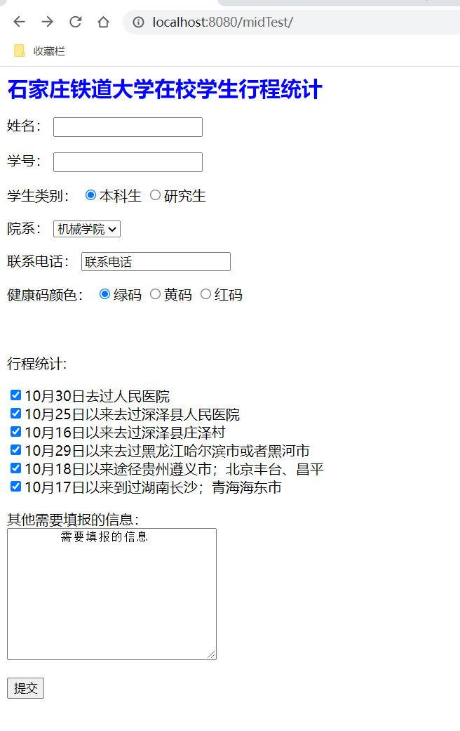 ①完成石家庄铁道大学在校学生行程统计页面(未完成0分,完成2分);