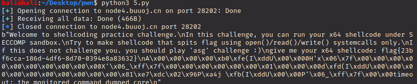 shellcode += shellcraft.read('rax','rsp',0x80) 读取0x80个字节到rsp中