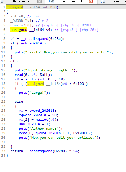 可以看到我们申请的chunk在v1[2】处,这里存放着chunk的地址指针,但是read确实从v1+1开始输入值,说明我们可以去覆盖这个地址