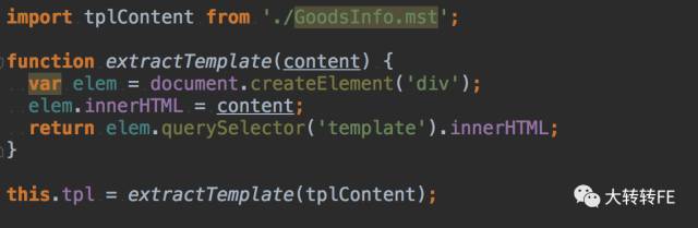 将 .mst 模板加载到页面中和 .less 方法差不多。在对应的 .js 文件中显式引入,然后用 extractTemplate 方法提取出模板内容即可: