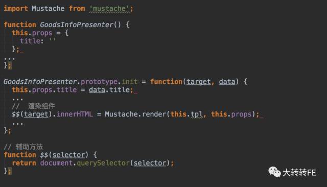 Mustache模板,样式采用Less语法,JS 部分则控制组件的渲染逻辑,尽量不关联业务逻辑,三者合一就相当于一个 .vue 文件了。通过修改 Webpack 配置或使用合适的插件,该方式可以同样支持其他模板和 CSS 语法,比如ejs或者SCSS; -