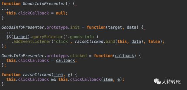 组件内部保存一个事件回调句柄 clickCallback,组件初始化时对用户点击事件进行数据绑定,并触发这个回调。