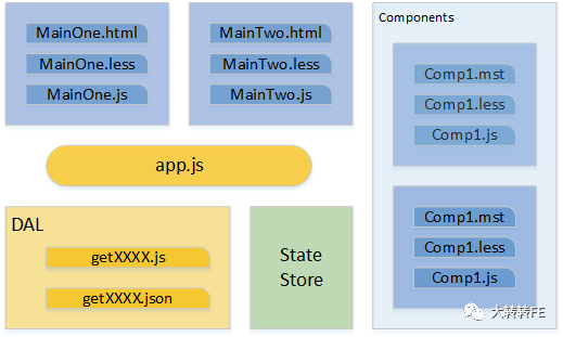 需要说明的是,图中的 State Store 其实目前是没有的,放在这里主要是为了好看 :)。后期如果把 vuex/MobX/Redux 之类的加进去了,那就完整了,目前因为业务逻辑很简单,状态什么的暴力解决就行了。而 app.js 则处理项目中公共的业务逻辑,让页面入口解脱出来专心处理内容。