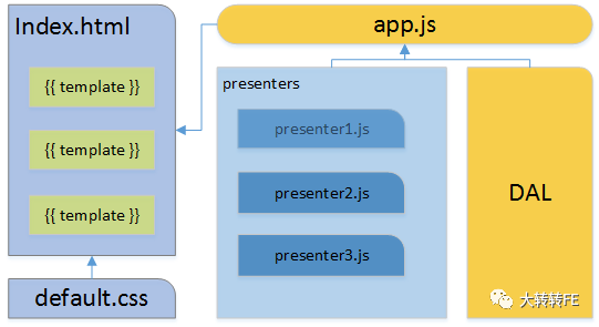 在小型 Web 页面中,一般是没有 Model 层的。页面中的 Presenter 部分只负责通过参数控制界面的渲染,并以组件的方式对外公开 View 层事件。按照这个思路,第一版项目结构就基本出来了,见下图: