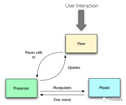 开始敲代码后,才发现另一个比较严重的问题:我需要把管理内容模板的代码单独分离出来,使其不会影响主要的业务逻辑,于是想到了 MVP(Model View Presenter) 模式。简单讲,这个就是 MVVM 模式去掉 View-ViewModel 双向数据绑定后的一个弱化版。如下图所示: