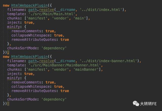 页面文件在 Webpack 中也是以模板的角色存在的,解析方式和模板一样,规则见上文。由于是页面入口文件,在 Webpack 中还需要使用 HtmlWebpackPlugin 插件进行配置。如下配置中,项目存在两个不同的页面入口,所以需要两个 HtmlWebpackPlugin 实例: