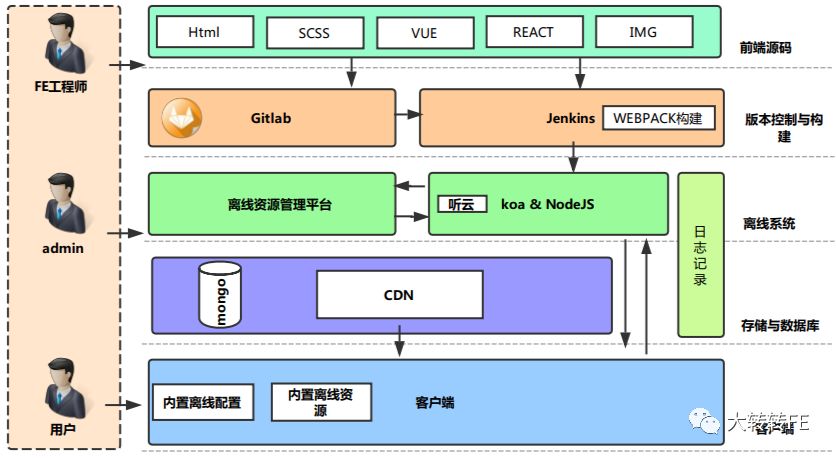 交由各个fe工程师手动上传吗? 这样显然不符合效率最大化的原则。幸好我们有持续集成和发布工具jenkins。在本团队的发布与上线流程中,jenkins代替fe工程师构建与部署前端项目。使前端项目也像传统的app与后端项目一样做到了开发与构建部署分离,提高了团队的效率。 而我们生成和部署离线包的操作,也交由jenkins替我们完成。