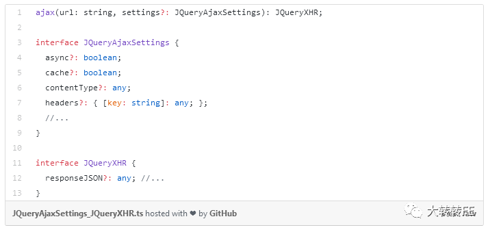 类型化签名肯定比未类型化的签名长,但是:string,:JQueryAjaxSettings和JQueryXHR并不是混乱的。 它们是提高代码的可理解性的重要文档。我们可以更深入地理解代码,而不必深入到实现或读取文档中。 我的个人经验是,我可以更快地阅读类型化代码,因为类型提供了更多的上下文来理解代码。