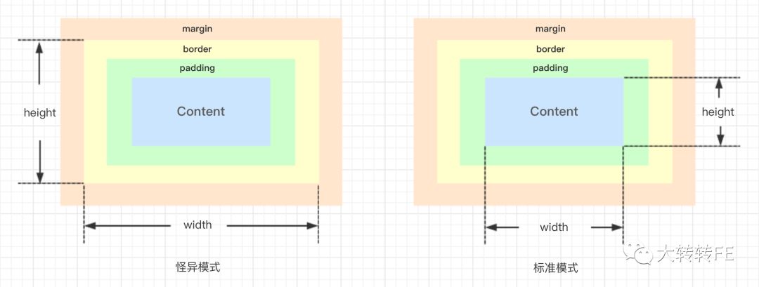通常浏览器里, 盒模型的分为两种模式, 两种模式(怪异模式和标准模式)下width和height的值不同, 怪异模式的width和height包含border、padding和content, 而标准模式下的width和height只包含content, 这就是为啥有些浏览器渲染出来的dom标签排版会乱。解决也很简单, 在标签的上面, 加上doctype的设置就好了, 让浏览器统一用同一种标准去解析页面。 怪异模式(左图)和标准模式(右图)的如下: