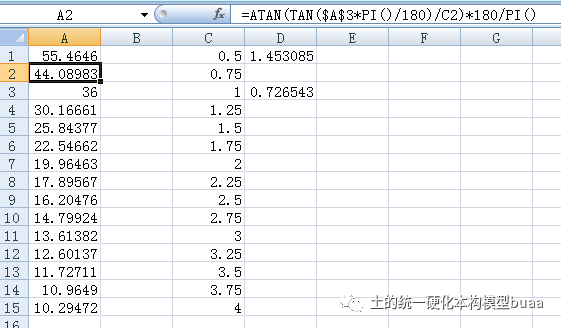 公式贴出来:=ATAN(TAN($A$3*PI()/180)/C2)*180/PI()