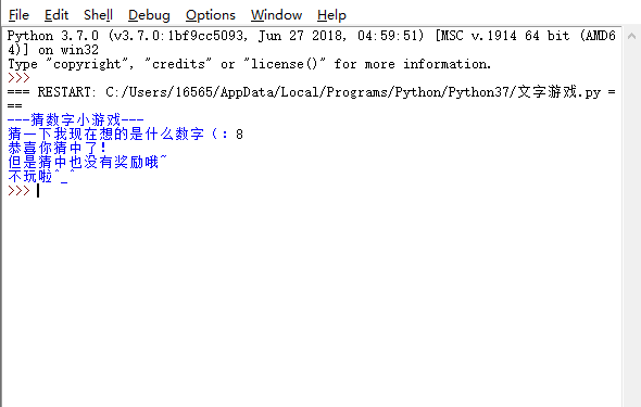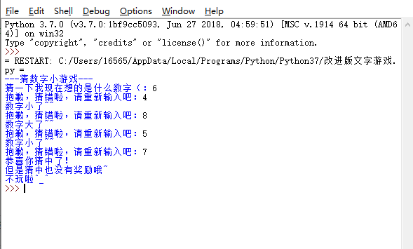 本次主要进行了简单的python小游戏改进,改进前的小游戏猜一次就结束了程序,并且所猜的数字是由代码编写者决定;而改进之中,使用到了随机数,这就决定了数字是在决定的区间内随机出现的,并且在猜数字时会提示你所猜的数字与正确的答案大了还是小了,直到猜对了才结束程序。