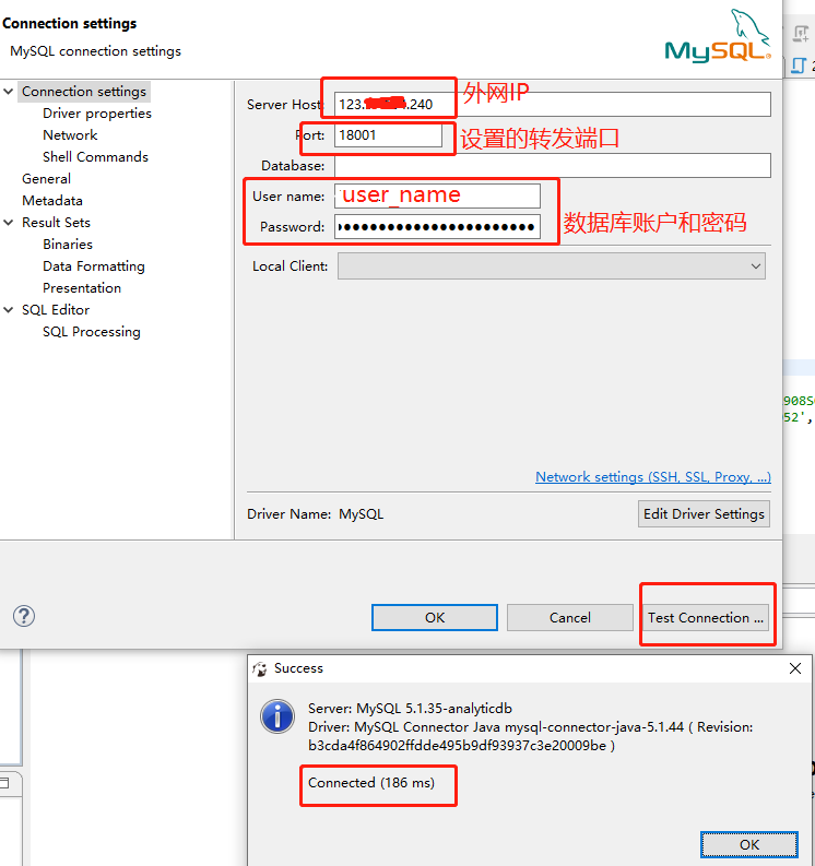 该库只能在 123.xxx.xxx.240 上进行访问,所以为了方便外网访问,需要进行端口转发,在 123.xxx.xxx.240 配置如下命令,设置转发端口