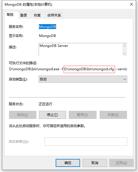 2、然后点击开始->搜索服务->打开服务,找到MongoDB->右键属性->记录一下红框中圈中的路径(后面会用到)