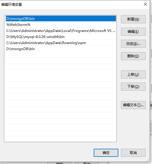 6、然后点击开始->搜索变量->打开编辑系统环境变量->环境变量->双击path->把D:\mongoDB\bin(这里选择你自己的安装路径)添加进去保存;