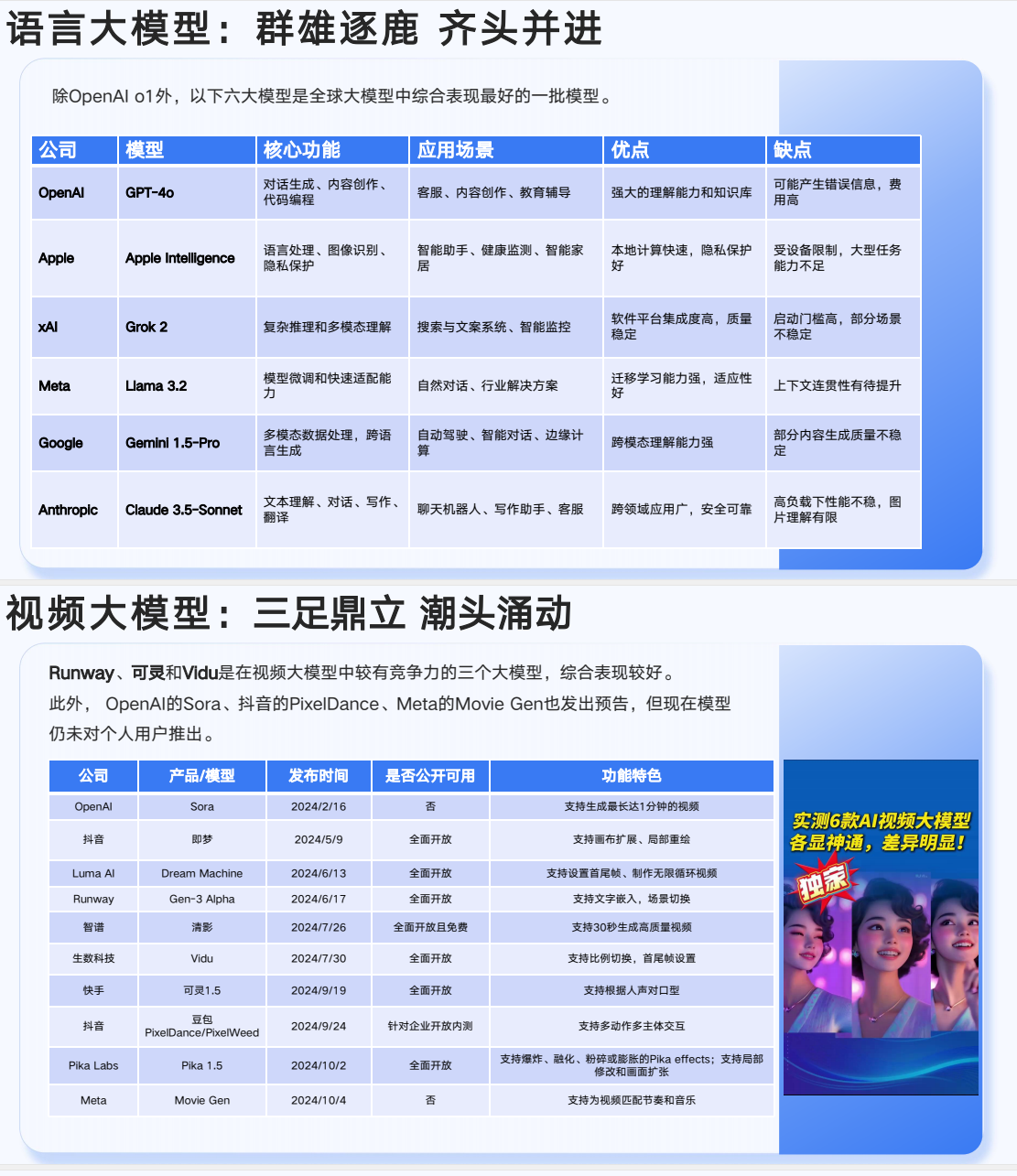 OpenAI的o1模型展现博士级推理能力,视频生成进入“三足鼎立”阶段(Runway、可灵、Vidu)。音乐领域Suno一枝独秀,2分钟生成带歌词编曲的完整歌曲。更震撼的是,AI已能全流程制作微短剧——央视AI微剧《中国神话》从剧本到配乐全部由机器完成。
