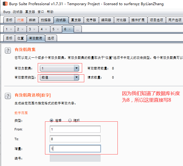 抓到包后,我们使用快捷键:Ctrl+I,此时测试器模块变成红色,我们点击进行爆破,先点击清除然后在7的前后添加符号