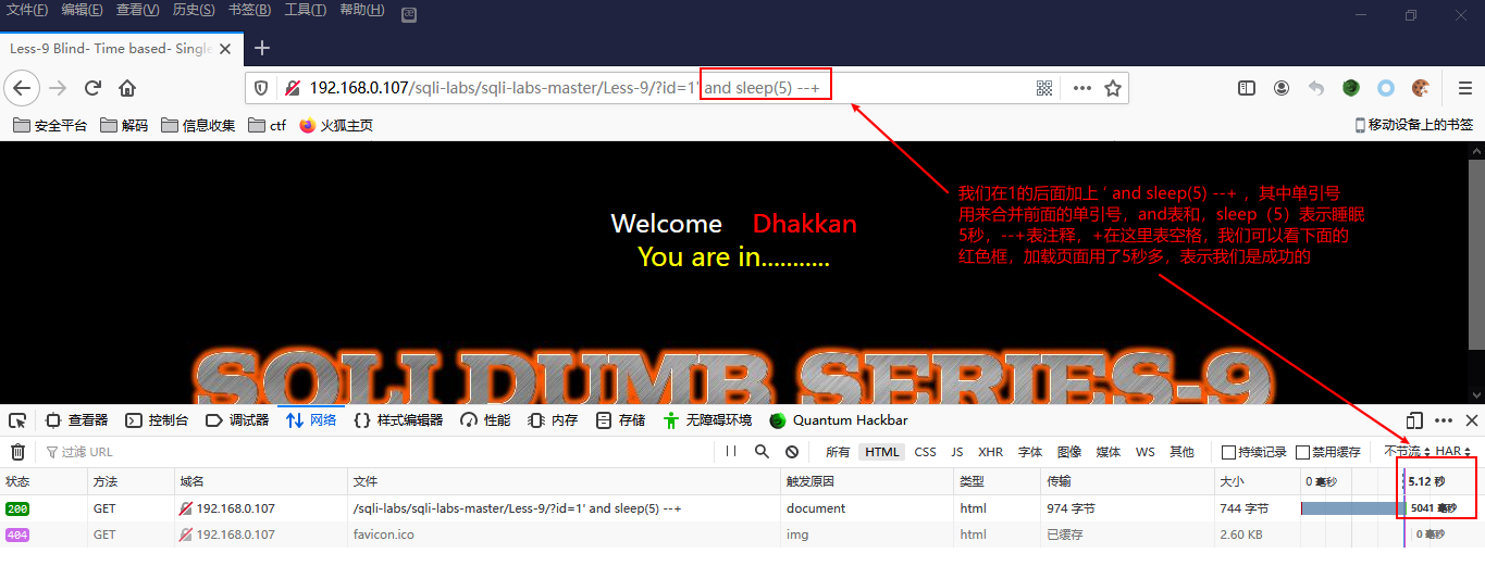 4.试一下在后面加' and sleep(5) --+,浏览器真的睡眠了5秒才加载出来,由此我们可以判断出这是一个单引号时间盲注