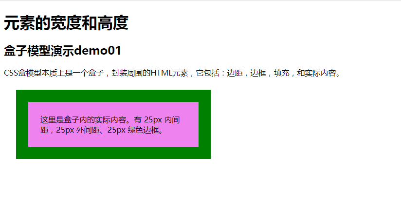 <!DOCTYPE html> <html lang="en"> <head> <meta charset="UTF-8"> <meta http-equiv="X-UA-Compatible" content="IE=edge"> <meta name="viewport" content="width=device-width, initial-scale=1.0"> <title>盒模型</title> <style> div { /* 背景颜色 */ background-color: violet; /* 宽度 */ width: 300px; /* 边框 */ border: 25px solid green; /* 内边距 */ padding: 25px; /* 外边距 */ margin: 25px; } </style> </head> <body> <h1>元素的宽度和高度</h1> <h2>盒子模型演示demo01</h2> <p>CSS盒模型本质上是一个盒子,封装周围的HTML元素,它包括:边距,边框,填充,和实际内容。</p> <div>这里是盒子内的实际内容。有 25px 内间距,25px 外间距、25px 绿色边框。</div> </body> </html>